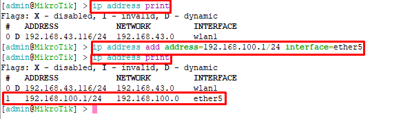 3. Lalu, Tambahkan IP Address untuk ether5 sesuai dengan topologi. Dengan perintah: ip address add address=192.168.100.1/24 interface=ether5 (enter). Lalu, Lihat statusnya. Dengan perintah: ip address print (enter). Dan terlihat bahwa IP address sudah berhasil ditambahkan.